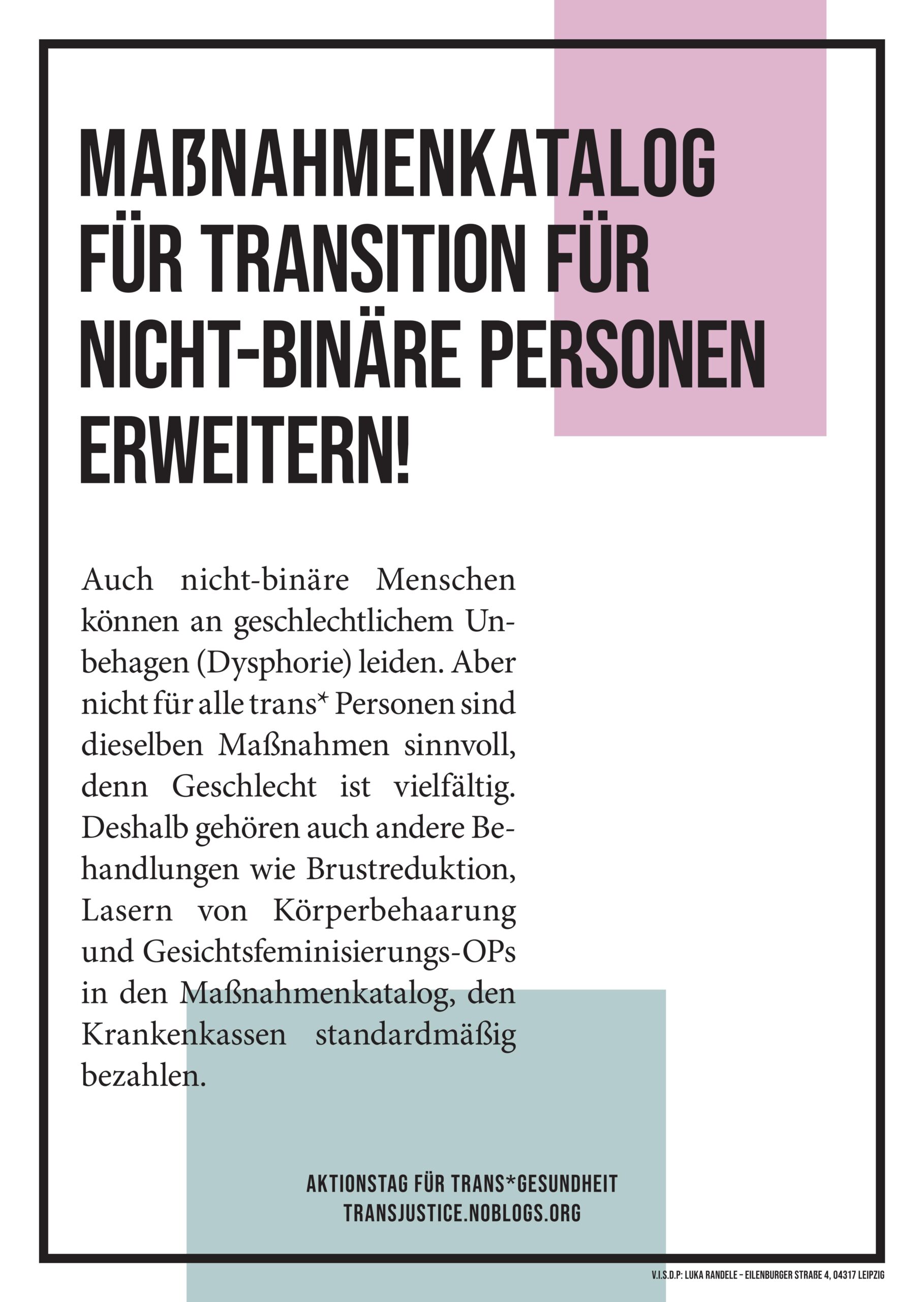 Have you always wanted to tell your local health insurance company that they need to take the health of trans* people more seriously? Why don’t you make it stick? We have posters with demands that you can use: Weiterlesen